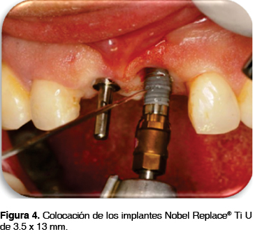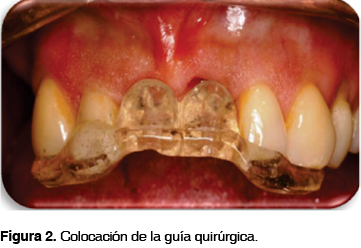 Con una previa realización de guías quirúrgicas se realizó la infiltración de anestésico local (mepivacaina 2%) en la región anterior del maxilar. Se decidió no realizar colgajo para preservar la papila interdental de los dientes adyacentes con el objeto de prevenir una mayor pérdida de tejido, debido a que es una zona altamente estética. Se ajustó la guía quirúrgica (Figura 2) para verificar si la posición mesiodistal y vestíbulo-palatina de los implantes era la correcta; posteriormente se realizó el fresado quirúrgico con la fresa inicial a 900 rpm hasta una longitud de 13 mm en ambos sitios. Se comprobó el paralelismo (Figura 3) y se colocaron los implantes Nobel Replace® Tapered TiU NP de 3.5 x 13 mm a 3 mm por debajo de la unión cemento esmalte de los dientes adyacentes en ambos sitios a una velocidad de 30 Ncm hasta obtener la longitud deseada (Figura 4).