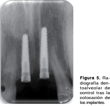 Posterior a la colocación de los implantes se llevo a cabo gingivoplastia en la periferia de los implantes para la colocación de los aditamentos protésicos rectos. Como procedimiento quirúrgico complementario se realizó frenectomía labial superior. Se tomó una radiografía de control posterior a la colocación de los implantes (Figura 5).