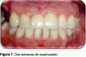 A la semana de control postoperatorio tras la colocación de los implantes (Figura 6), se realizó el retiro de sutura del área del frenillo, ya que no presentaba datos de alteración cicatrizal de herida quirúrgica observándose una adecuada cicatrización. En el control postoperatorio a las dos semanas (Figura 7) se observó casi completa la cicatrización del área del frenillo. En la zona de los implantes se observó tanto clínicamente como radiográficamente los tejidos periimplantares en adecuada salud. La paciente no refirió ningún tipo de sintomatología.