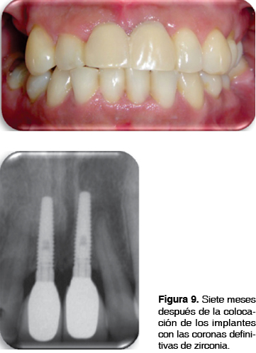 A 7 meses de postcolocación de los implantes (Figura 9) se observó una armonía de los tejidos periimplantares y una buena altura de la papila interdental. Radiográficamente se observó una calidad ósea aceptable en la periferia de los implantes, encontrándose asintomáticos; además no presentaron ningún tipo de movilidad.