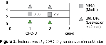 El índice ceo-d fue de 2.97 ± 2.1 y el CPO-D fue de 3.08 ± 2.18 (Figura 2).