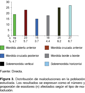 En la figura 1 se aprecia que el 33% de los examinados (127) presentaron algún tipo de maloclusión, dentro de las cuales la más frecuente fue la sobremordida vertical (observada en 27 escolares) y la menos observada la mordida cruzada posterior (en 15 escolares). Obsérvese en la figura 3 a continuación: