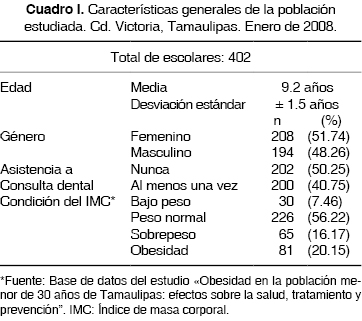 Se realizó un estudio transversal comparativo -analizado como casos y controles- en 402 escolares entre 7 y 12 años de edad. Dichos escolares fueron seleccionados en forma aleatoria simple de la base de datos del estudio ''Obesidad en la población menor de 30 años de Tamaulipas: efectos sobre la salud, tratamiento y estrategias de prevención'' del Hospital Infantil de Tamaulipas. Proyecto actualmente en desarrollo, el cual se lleva a cabo con financiamiento del Fondo Mixto Conacyt-Gobierno de Tamaulipas con clave tamps 2005-c08-27. Se incluyeron en el presente trabajo a los escolares de tres escuelas primarias públicas (348 escolares) y una escuela privada (54 escolares) los cuales contaban con la medición de su composición corporal, en ausencia de enfermedades sistémicas y con la autorización de los padres o tutores. El tamaño de la muestra fue calculada utilizando el paquete SSIZE versión 2.0 con un alfa de 5 y un poder de 90. A todos ellos se les realizó una exploración bucal para lo cual se contó con la participación de siete estomatólogos, quienes fueron capacitados para estandarizar los criterios de medición. El examen bucal se efectuó en un aula de cada escuela participante, la cual se adaptó adecuadamente para dicho efecto. Las actividades se distribuyeron en dos equipos de trabajo de la siguiente manera: el primero, integrado por tres estomatólogos responsables del examen bucal; el segundo, se encargó de registrar en la ficha de captura, los resultados de dicho examen, así como los datos de identificación de cada escolar. Para la inspección oral se utilizaron espejos bucales del número 5, exploradores, abatelenguas, guantes desechables, cubrebocas y luz artificial.