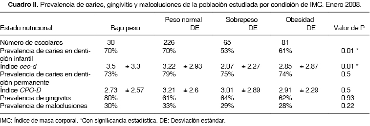En el cuadro II se muestran los resultados de las patologías estudiadas dividiendo a los escolares según la condición de peso. En ella se puede observar que la prevalencia de caries es semejante en las diferentes condiciones de estado nutricional cuando se trata de la dentición permanente; en cambio, en la dentición primaria es menor en escolares con sobrepeso u obesidad (p = 0.01).