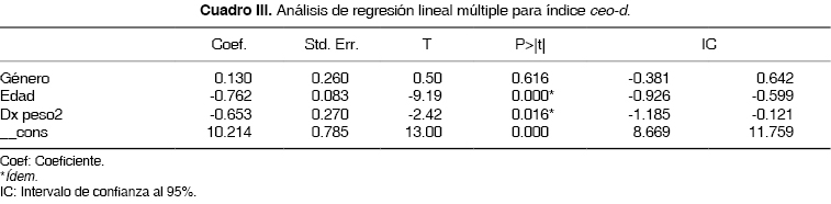De igual manera, por cada cambio en la edad, el índice ceo-d se modifica en promedio -0.762 (Cuadro III) ajustándose por condición de peso y género (p = 0.000).