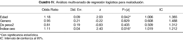 En el análisis de regresión logística, se encontró una relación estadística significativa de las maloclusiones con el índice ceo-d (p = 0.016) y la edad (p = 0.042) influyendo éstas en el riesgo de presentar maloclusión. Al evaluar la posible asociación entre el estado nutricional y las maloclusiones, no se encontró significancia estadística; del mismo modo el género no influye en la presencia de éstas (Cuadros II y IV).