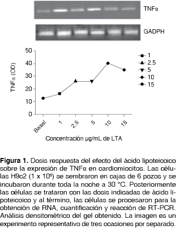 Los cardiomiocitos se trataron con ácido lipoteicoico a diferentes dosis. El análisis densitométrico de RT-PCR reveló que la expresión de TNFα es dependiente de la concentración de ácido lipoteicoico (Figura 1). El primer punto corresponde al basal, esto es, en donde no existe estimulación con ALT y por lo tanto, al no haber una respuesta inflamatoria a la toxina, no existe expresión de TNFα. Esta última se observó desde la concentración más baja utilizada en el estudio (1 μg/mL); que cursó con un incremento gradual al aplicar 2.5 y 5 μg/mL y aumentó significativamente al aplicar una dosis de 10 μg/mL provocando los niveles más altos de expresión. En una dosis de 15 μg/mL pudimos observar un decremento en la expresión de TNFα que se tradujo en la saturación de receptores celulares. La expresión de TNFα fue determinada por densidad óptica y analizada con el programa LabWorks®.