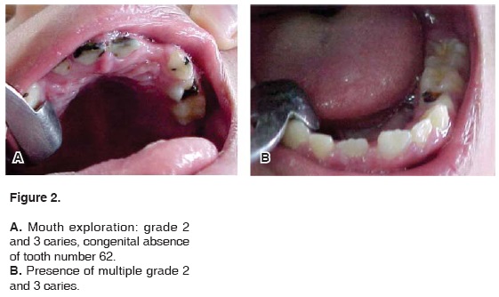 Exploration of the mouth revealed early stage mixed dentition, clinical absence of tooth 62, gingival swelling, presence of dento-bacterial plaque, and multiple grade II and III caries (Figures 2A and 2B).