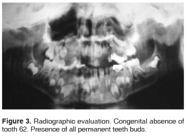 Radiographically, the following could be observed: congenital absence of tooth number 62, presence of all permanent tooth buds; 11,12, 13, 14, 15, 16, 17, 21, 22, 23, 24, 25, 26, 27, 31, 32, 33, 34, 35, 36, 37, 41, 42, 43, 44, 45, 46 and 47 (Figure 3).