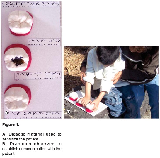 Practice consisted in presenting didactic materials to the patient so that he could get acquainted with it and could become sensitive to different textures, so as to later relate them to dental, periodontal and caries tissues. Thus it would be easier for the patient to understand the treatment that was going to be given to his mouth, so he could become cooperative and his conduct would take a favorable turn (Figure 4B).