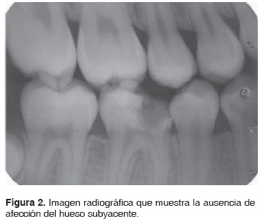 2. Ausencia de terapia periodontal intraoperatoria: a pesar de la relativa buena higiene oral de la paciente, no se realizó terapia periodontal transoperatoria (raspado y alisado radicular), lo que pudo desencadenar un «secuestro» de restos de placa bacteriana que permanecieron debajo de la lesión durante la cicatrización, provocando el proceso infeccioso crónico que dio paso a la recidiva.2,15