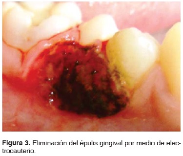 3. Insuficiente técnica quirúrgica: en el caso descrito, se utilizó electrocauterio como método para realizar la eliminación del épulis. El área de trabajo de este instrumento se limita únicamente a nivel supraperióstico sin alcanzar hueso. Es probable que la recidiva de la lesión se debió a la falta de legrado quirúrgico de las paredes óseas.26