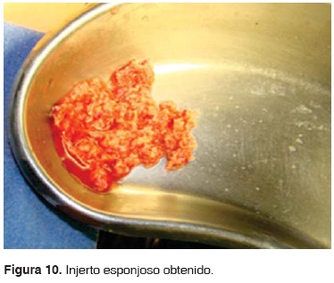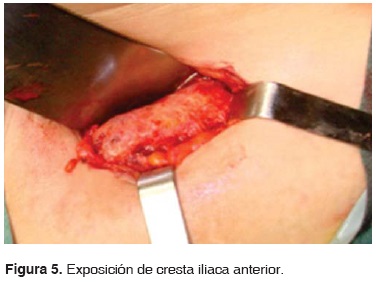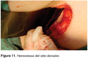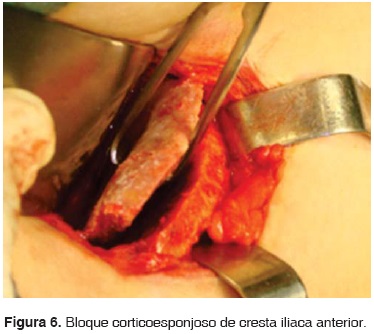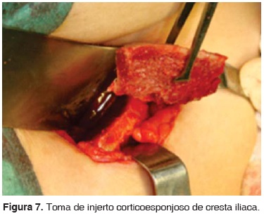 El procedimiento se realiza bajo anestesia general balanceada, iniciando con la toma de injerto de cresta iliaca anterior siguiendo la técnica de Kalk, tomando bloque corticoesponjoso con cierre reciprocante, cincel recto y curvo; el hueso esponjoso adicional se toma con curetas. Teniendo el injerto se realiza hemostasia mediante la colocación de cera para hueso9,13 (Figuras 4 a 11) (5, 6, 7, 8, 9, 10).