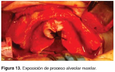 Inmediatamente se realizan odontectomías de órganos dentales residuales conservando el alvéolo, así como una incisión lineal mucoperióstica a la cual se le colocan puntos de suspensión con sutura seda 3-0 en la mucosa platina (Figuras 12 y 13).