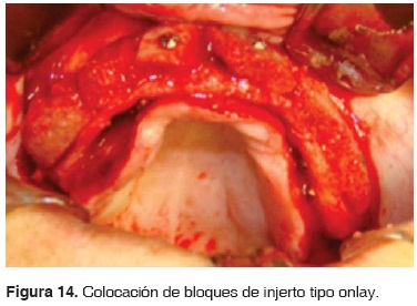 Una vez expuesto el proceso alveolar se realiza decorticación de cortical vestibular, así como de una pared del injerto, colocando los bloques de injerto tipo onlay, sujetándolo con tornillos de 1.5 mm de diámetro y 10 mm de largo para fijación; el material de osteosíntesis fue colocado en dirección vestibular del injerto a proceso alveolar; al realizar este procedimiento a nivel de la región canina donde está la parte más curva del proceso maxilar algunos bloques del injerto comenzaron a fracturarse por lo que se cambió la dirección de éstos, iniciando por la cara palatina, evitando con esto la pérdida de algunos bloques (Figura 14).