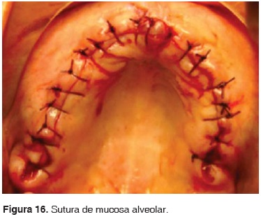 Una vez fijado el injerto en bloque así como el esponjoso y la membrana de colágeno, se realiza elevación de mucosa vestibular quitando tensión en el periostio para tener un cerrado mucoso sin tensión ni exposición del injerto suturando con puntos simples (Figura 16).