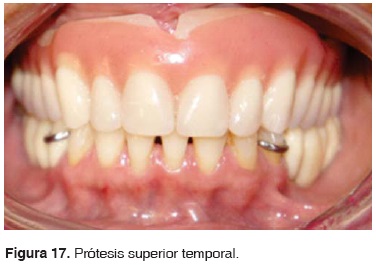 La paciente cursa postoperatorio sin complicaciones en herida de cresta iliaca e intraoral, por lo que se coloca prótesis temporal con acondicionador de tejidos (Figura 17).