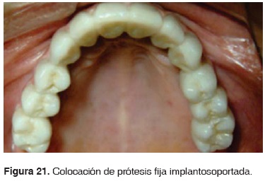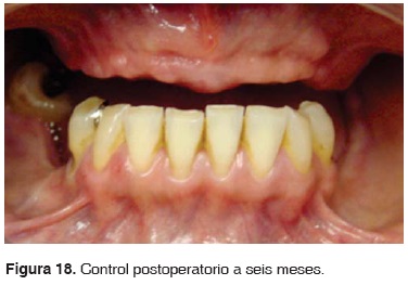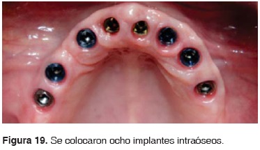 Con los anteriores procedimientos, se obtiene a los seis meses un proceso alveolar lo suficientemente amplio en longitud y en espesor (Figura 18), permitiendo la colocación de ocho implantes intraóseos (Figuras 19 y 20).