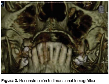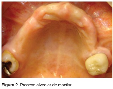 Se trata de una paciente del sexo femenino de 60 años de edad sin antecedentes crónico-patológicos, la cual refiere como queja principal inestabilidad de prótesis superior, siendo ésta el resultado de múltiples especialistas. A la exploración física intraoral presenta dentición secundaria incompleta, maxilar con presencia de dos órganos dentales con movilidad grado III, proceso alveolar atrófico clasificación IV de Cadwood y Howell, que a su calibración clínica medía 3 mm de espesor, lo cual se confirma con estudio tomográfico (Figuras 1 a 3) (2).