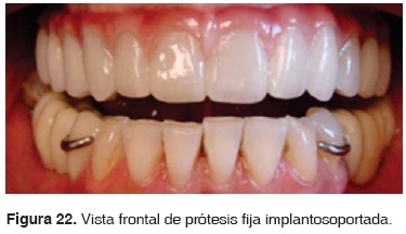 Después se coloca una prótesis fija total implanto soportada de zirconio-cerámica con una evolución de cuatro años, reconstruyendo el proceso alveolar en altura como en espesor a largo plazo, cumpliendo el objetivo quirúrgico así como las expectativas estéticas de la paciente (Figuras 21 a 23)(22).