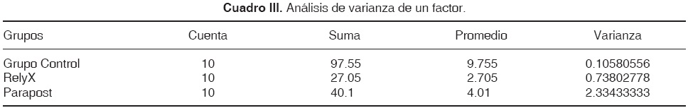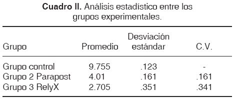 En el cuadro I se muestran los valores del grupo control, así como de los grupos de prueba con los sistemas de reconstrucción Parapost y RelyX. Todos los especímenes presentan valores de microfiltración (Figuras 1 y 2).