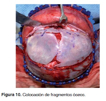 La disección subperióstica se continúa por debajo de la porción lateral e infraorbitaria del rim orbitario, incluye la porción anterior y superior del cigoma y maxilar (no el arco cigomático). La porción posterior del SCALP se diseca en plano subperióstico, hasta la porción media entre la sutura coronal y la lambdoidea. Se realiza craneotomía bifrontal, por el neurocirujano, se realiza disección extradural para preservar el encéfalo siguiendo los principios de cirugía craneofacial (Figura 9).
