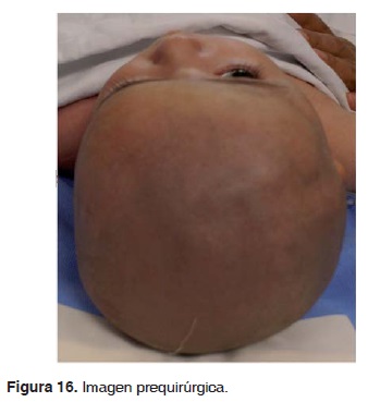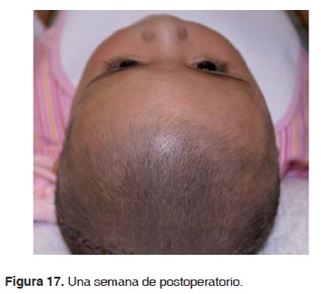 Las anormalidades craneales han sido un gran reto por siglos, ya que elegir el tratamiento ideal en ocasiones es controversial, existiendo quienes refieren ser de elección la craneotomía frontal unilateral, y otra corriente que considera mejor opción la craneotomía bifrontal. El caso presentado en este artículo refuerza aún más la segunda corriente, ya que los resultados obtenidos han sido excelentes y satisfactorios tanto para el paciente como para el cirujano (Figuras 16 y 17).