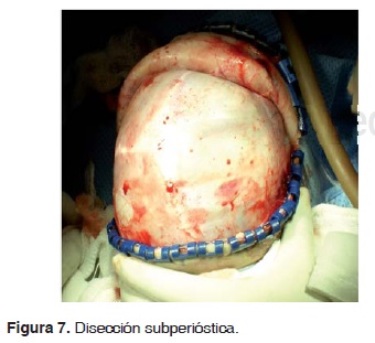 Se utiliza un abordaje bicoronal retroauricular (SCALP), la porción anterior del abordaje es levantado a lo largo del músculo temporal en un plano sub-perióstico (Figuras 6 y 7). Continúa una disección circunferencial orbitaria bilateral, con relación al canto lateral, pero preservando la integridad del canto medial y el aparato nasolagrimal (Figura 8).