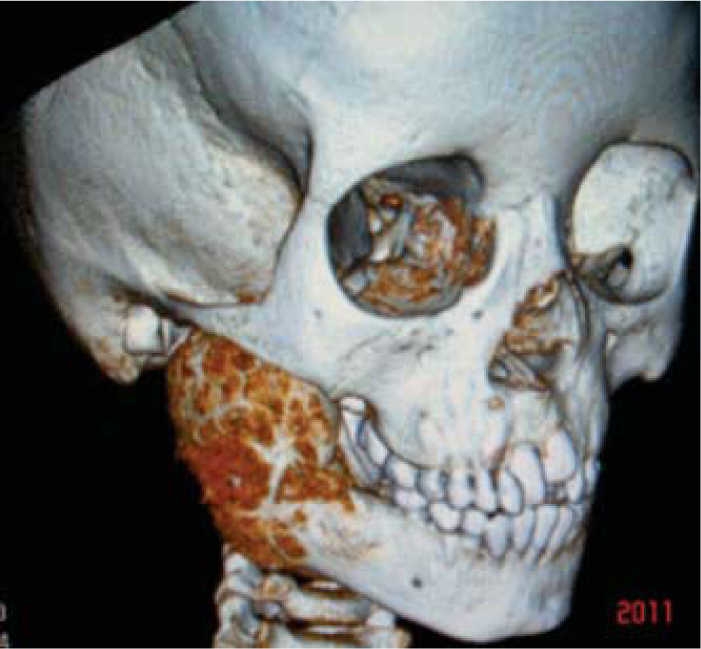 Six year old female patient exhibiting volume increase at the right side of the mandible. Lesion was of a four month evolution. Lesion was of rapid growth and elicited mild pain (Figure 1). Intraorally, expansion of mandibular cortical bone at molar level could be observed. Three-D tomogram confirmed widespread bone destruction (Figure 2). Patient's general health had not been compromised with absence of general signs and symptoms. Laboratory results were within normal parameters. Incisional biopsy report revealed benign mandibular osteoblastoma. In view of lesion's widespread destruction and aggressive local behavior, a right hemi-mandibulectomy was performed (Figure 3). A mandibular reconstruction prosthesis with condyle was placed on the surgical bed (Figure 4). Post operative control showed suitable oral opening, with undamaged main nerve structures, motor and sensory nerves preserved their continuity (Figure 5).