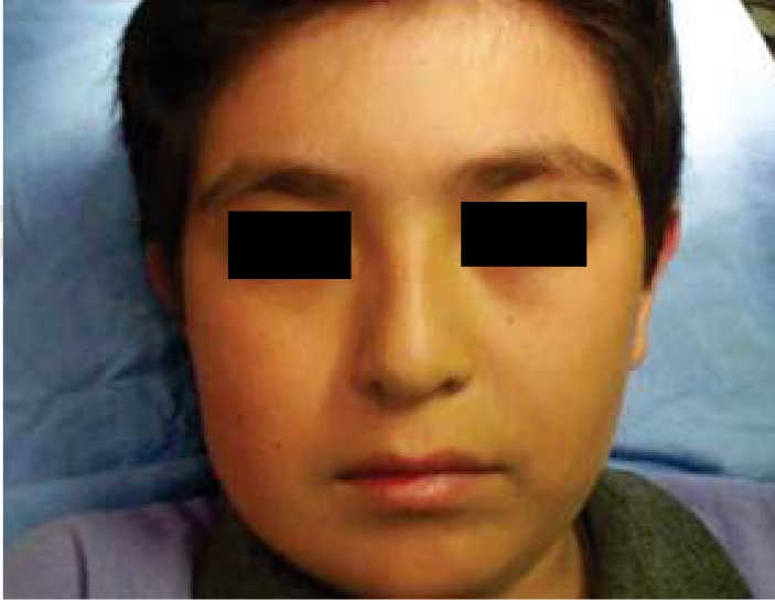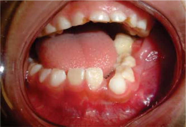Eight year old female patient who attended the clinic with increase in left hemi-mandibular volume. Lesion was of a 5 month evolution with fast, painful growth (Figure 6). Intra-orally, expansion of vestibular cortical bone was observed, with tooth displacement (Figure 7). X-rays revealed a lesion destroying part of the body and ramus on the left side of the mandible, nevertheless, condyle and coronoid apophyses were preserved (Figure 8). The patient did not exhibit any other relevant data; laboratory exams yielded normal parameters. Result of incision biopsy was mandibular plexiform ameloblastoma. Block excision was undertaken in view of the lesion's local aggressive behavior (Figure 9). A reconstruction prosthesis was placed with preservation of condyle and coronoid apophyses (Figure 10). No complications were observed during post-operative period; motor and nerve structures were preserved. The patient exhibited suitable oral opening and appropriate facial appearance (Figure 11).