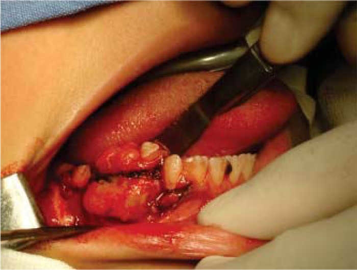 A 13 year old female patient sought consultation due to a lesion in the right mandibular alveolar process. The lesion was of a three month evolution, painful and of rapid growth, with mild paresthesia in the right lower lip. The lesion exhibited a granular and bloody appearance, with sessile base (Figure 12), X-rays revealed a diffuse, radio-lucid area, at the level of right lower premolars. No other relevant pathological data were observed. Biopsy outcome yielded result of mandibular ameloblastic fibroma. A block resection of the lesion was undertaken with lower ridge preservation (Figure 13).