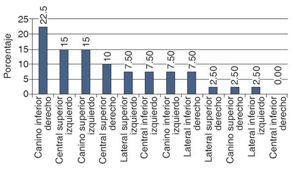 A nivel preoperatorio 169 (93.9%) dientes no evidenciaron recesiones gingival, 11 (6.1%) casos evidenciaron recesiones de clase I. A nivel postoperatorio 140 (77.8%) dientes no evidenciaron recesiones y 40 (22.2%) dientes presentaron recesiones de clase I. De los dientes con recesiones la mayoría de los casos correspondieron a caninos inferiores derechos (22.5%) (Cuadro I y Figura 1).