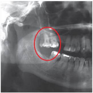 El quiste dentígero puede adoptar un tamaño importante y causar expansión ósea ya que es asintomático con notable capacidad de crecimiento. Si bien se relaciona con la corona de un diente permanente, con menor frecuencia, puede hacerlo con temporales o cuartos molares (Figuras 22 y 23).48