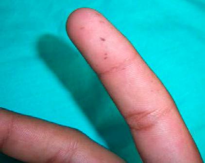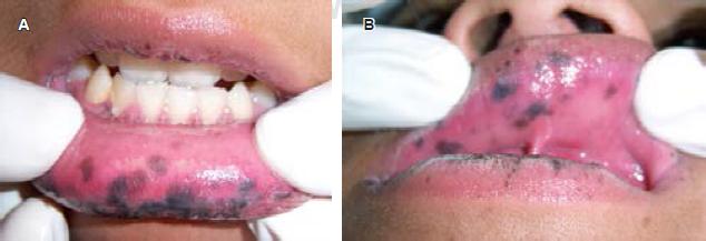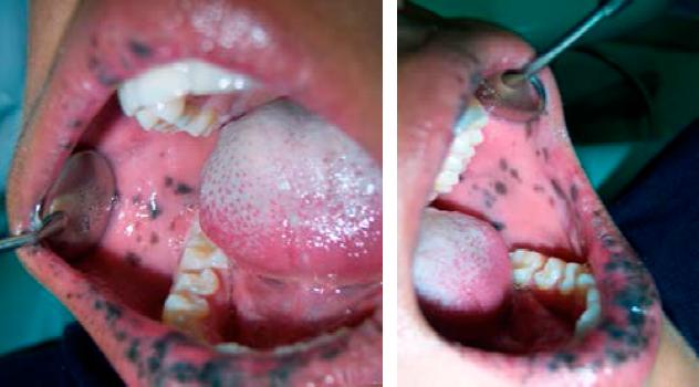 A la exploración clínica se observan múltiples máculas que confluyen entre sí en el borde bermellón del labio superior e inferior, siendo más abundantes en el labio inferior (Figura 1). Presenta también máculas generalizadas en mucosa labial y mucosa yugal (Figura 2), y sólo unas cuantas a nivel de la papila incisiva y paladar duro (Figura 3), respetando la mucosa lingual y piso de boca. El paciente presentó una mancha melánica difusa en la falange distal del dedo índice de la mano derecha (Figura 4).