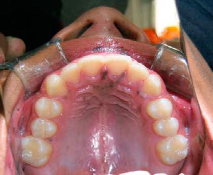 Figura 3 Máculas dizfusas en paladar duro predominando a nivel de la papila incisiva. Nótese que también presenta manchas melánicas adyacente a las fosas nasales.