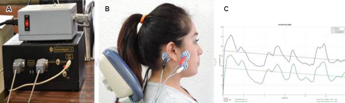 El registro de la raíz cuadrática media (Root Mean Square [RMS] se realiza en máxima intercuspidación y se reporta en microvoltios por segundo (μV/s) (Figura 1).