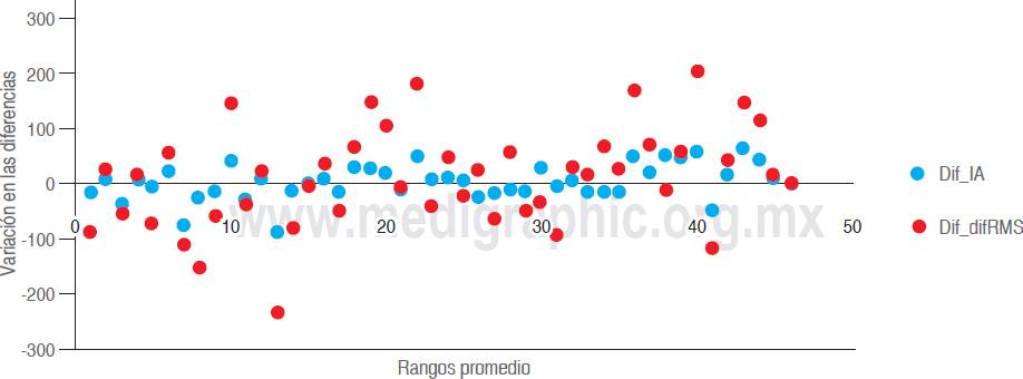 Se observa la dispersión de las diferencias de RMS (rojo) y en el índice de asimetría (azul) de cada uno de los pacientes. Es evidente que el comportamiento de estas dos variables no muestra ningún patrón o tendencia de comportamiento significativa con el paso del tiempo; sin embargo, se ilustra que la mitad de los pacientes presentan comportamiento negativo al igual que positivo (Figura 2).