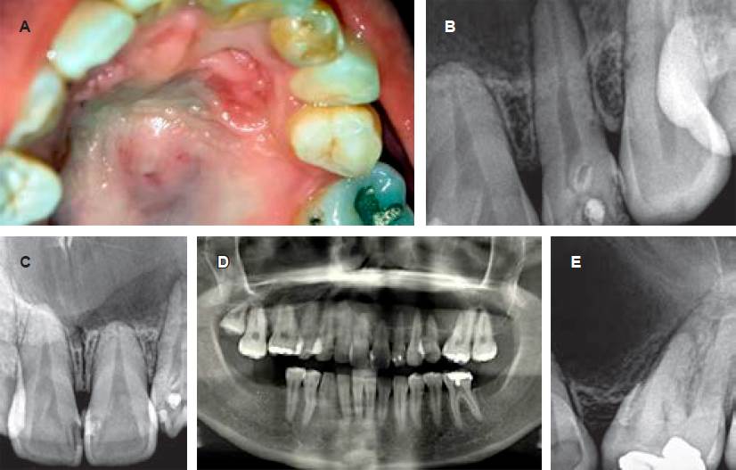 Figura 1 Características clínico-radiográficas del caso. A) Se observa sobre la bóveda palatina una lesión discretamente elevada, con superficie eritematosa y zonas azulinas, en la cual durante las maniobras de palpación se podía evidenciar fluctuación y un contenido líquido. Estas maniobras generaban intenso dolor y sensación de opresión en la zona. Además, es importante observar la morfolog lóbulo palatino de gran tamaño, asemejándose a la corona clínica de un premolar. B) Imagen radiográfica de dens invaginatus ía dentaria de la corona y la coloración del incisivo lateral, donde se puede evidenciar un coronario en el incisivo lateral superior izquierdo y una zona de rarefacción ósea en el ápice radicular. C) Imagen radiográfica sector anterior de incisivos centrales, donde se puede observar una imagen radiolúcida que involucra dichas piezas dentarias, separadas del tejido óseo normal circundante por una discreta línea radiopaca. D) En la ortopantomografía, obsérvese una imagen osteolítica que abarca el hemimaxilar izquierdo. E) En esta imagen radiográfica se puede observar el límite posterior de la lesión osteolítica con una zona radiolúcidaquellegaagenerardesplazamientodentariodel primer molar superior izquierdo.