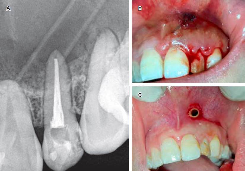 Figura 3 Colocación de drenaje con fines descompresivos. A) Radiografía postendodoncia y colocación inmediata de drenaje. B) Se puede observar la sutura del tubo de drenaje a la mucosa alveolar. C) Mucosa sana circundante al drenaje, fotografía obtenida durante un procedimiento de reemplazo del tubo siliconado.