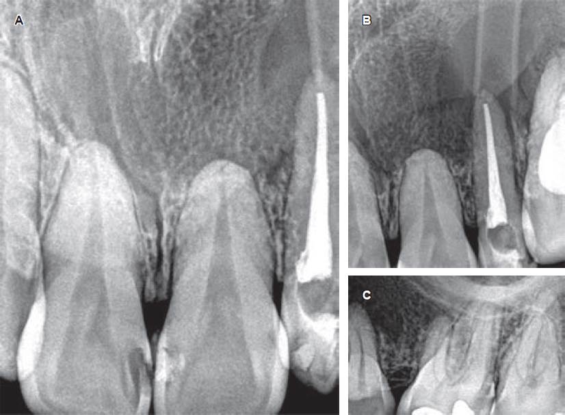 Figura 4 Imágenes radiográficas periapicales de control. A-C) Imágenes radiográficas periapicales de control durante el seguimiento clínico del caso, observando la aposición de tejido óseo en las áreas periféricas del quiste, y reducción del tamaño de la lesión.