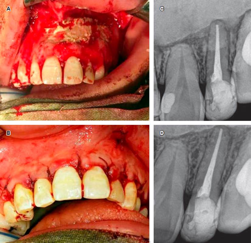 Figura 5 Remoción del remanente quístico y colocación de sustituto óseo. A-B) Muestran el colgajo amplio realizado para el abordaje y el lecho quirúrgico postquistectomía rellenado con el sustituto óseo, el cual fue debidamente compactado en el interior del tejido óseo. Luego de la colocación de membrana reabsorbible, se realizó la reposición del colgajo mucoperióstico y la sutura correspondiente. C) Radiografía postquirúrgica inmediata donde puede observarse el material de relleno como una masa densa radiopaca. D) El control radiográfico al año muestra normalidad de los tejidos dentarios y peridentarios, y persistencia del sustituto óseo.