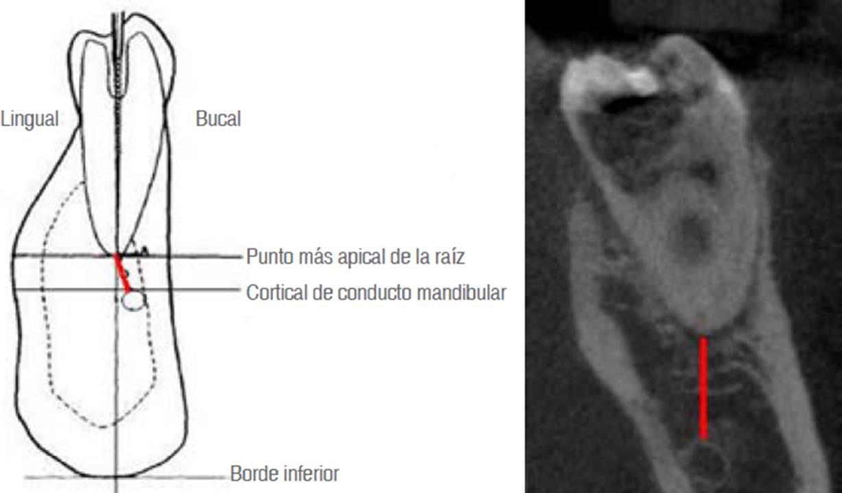 Figura 1 Representación de la medición desde el punto más apical de la raíz hacia la parte cortical más cercana del conducto mandibular.