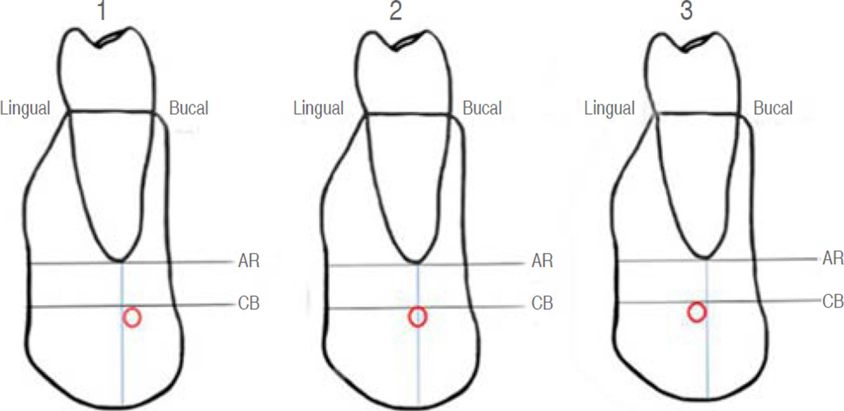 Respecto a la posición en sentido buco-lingual, se determinó que a nivel del segundo premolar, en la mayoría (78%) el conducto se encuentra en una posición bucal; a nivel del primer molar en su raíz mesial, en la mayoría (68.6%) el conducto se encuentra en una posición lingual; a nivel del primer molar en su raíz distal, en la mayoría (88.9%) el conducto se encuentra en una posición lingual; a nivel del segundo molar en su raíz mesial, en la mayoría (73.1.%) el conducto se encuentra en una posición lingual; a nivel del segundo molar en su raíz distal, en la mayoría (71.9%) el conducto se encuentra en una posición lingual (Figura 3).