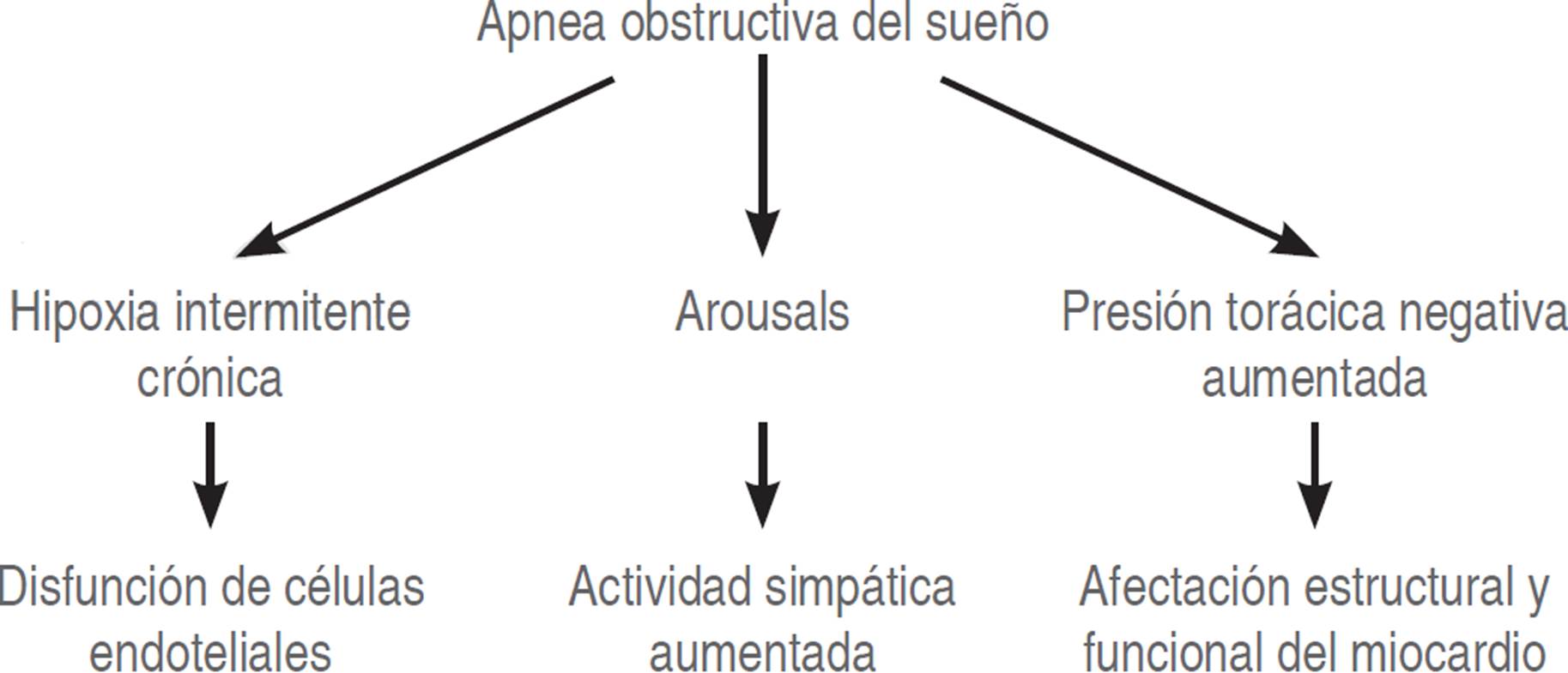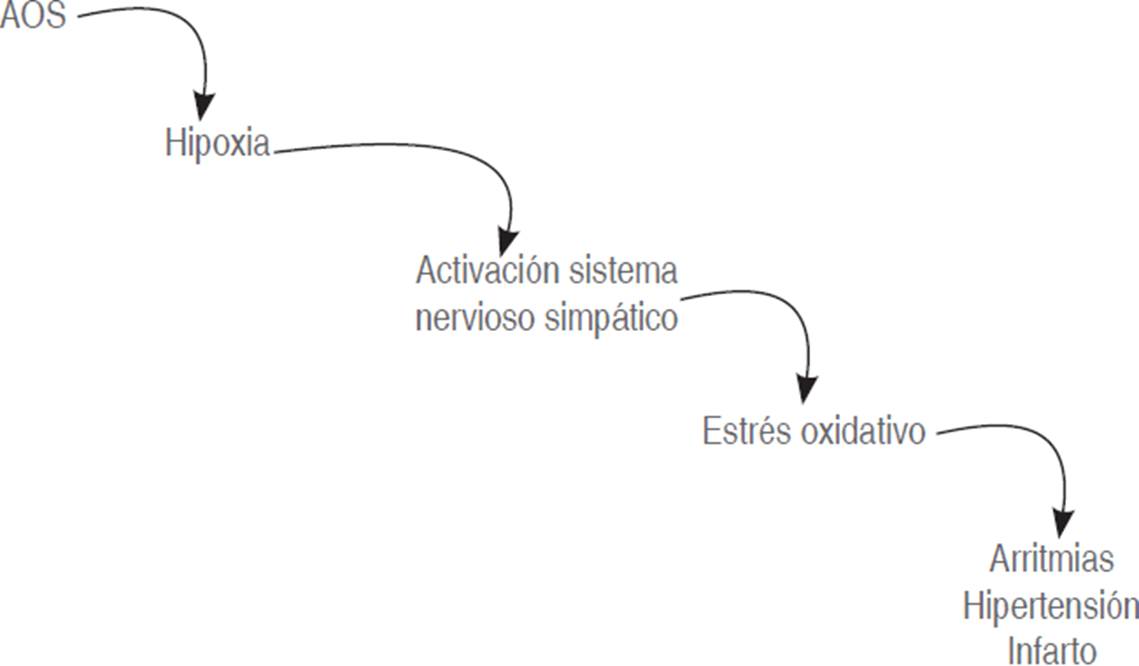 Los efectos nocivos inducidos por AOS en el sistema cardiovascular implican dos componentes: primero, hipoxia intermitente crónica repetida, que resultan en sobrecarga simpática; segundo, grandes presiones intratorácicas negativas durante los esfuerzos inspiratorios. Esto sobrecarga el miocardio alterando su estructura y función y conduce a una mayor actividad simpática (Figura 2).5