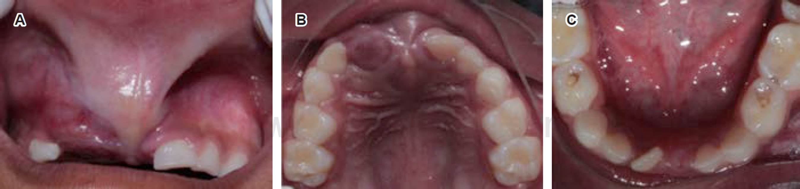 Figura 2 Al examen intraoral es perceptible un aumento de volumen en la región anterior del maxilar (A), que va del paladar duro hacia la mucosa vestibular y frenillo labial superior, lo que ocasiona deformación del reborde alveolar (B). La encía inser tada con aspecto rojo-azulado. En los dientes de la arcada inferior se observan cavidades por caries en esmalte y dentina (C).