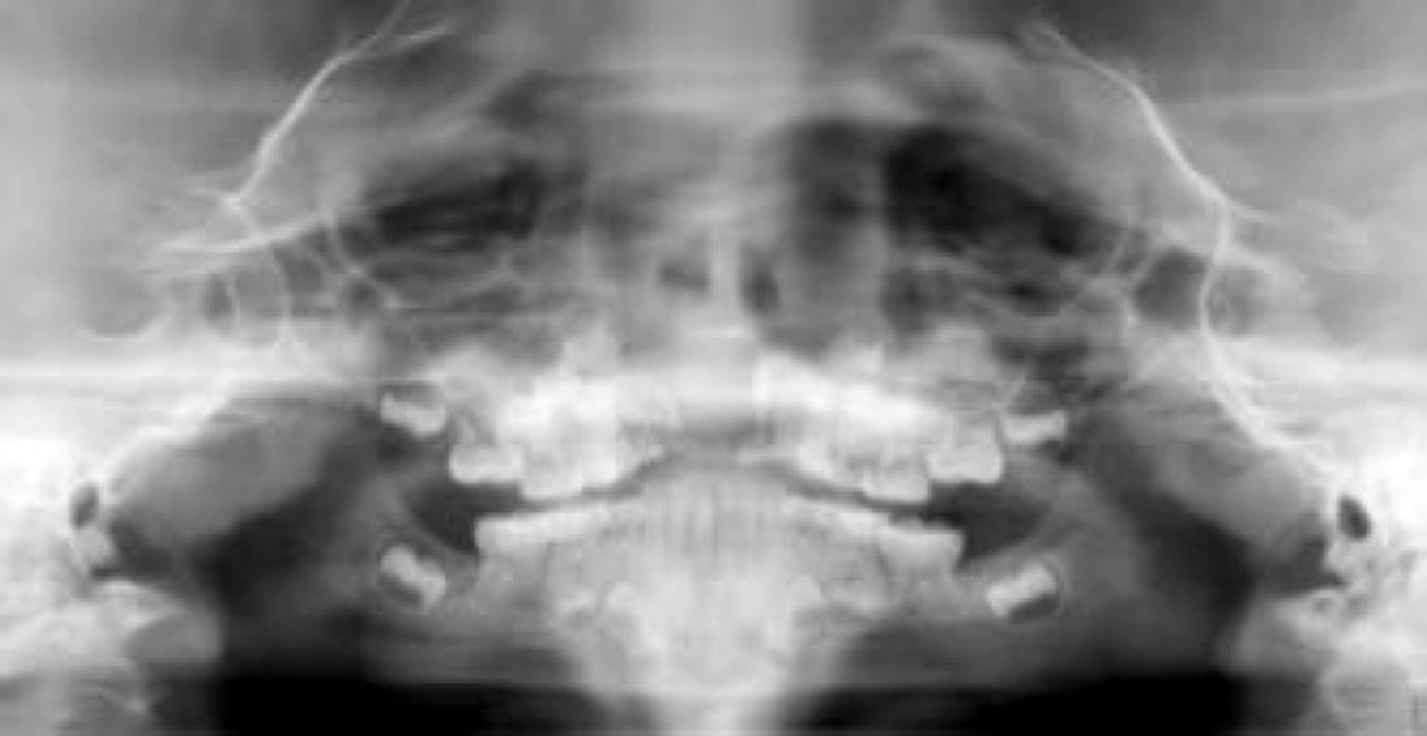 Figura 3 La ortopantomografía muestra una lesión osteolítica unilocular, con desplazamientos de órganos dentarios y gérmenes de dientes permanentes.