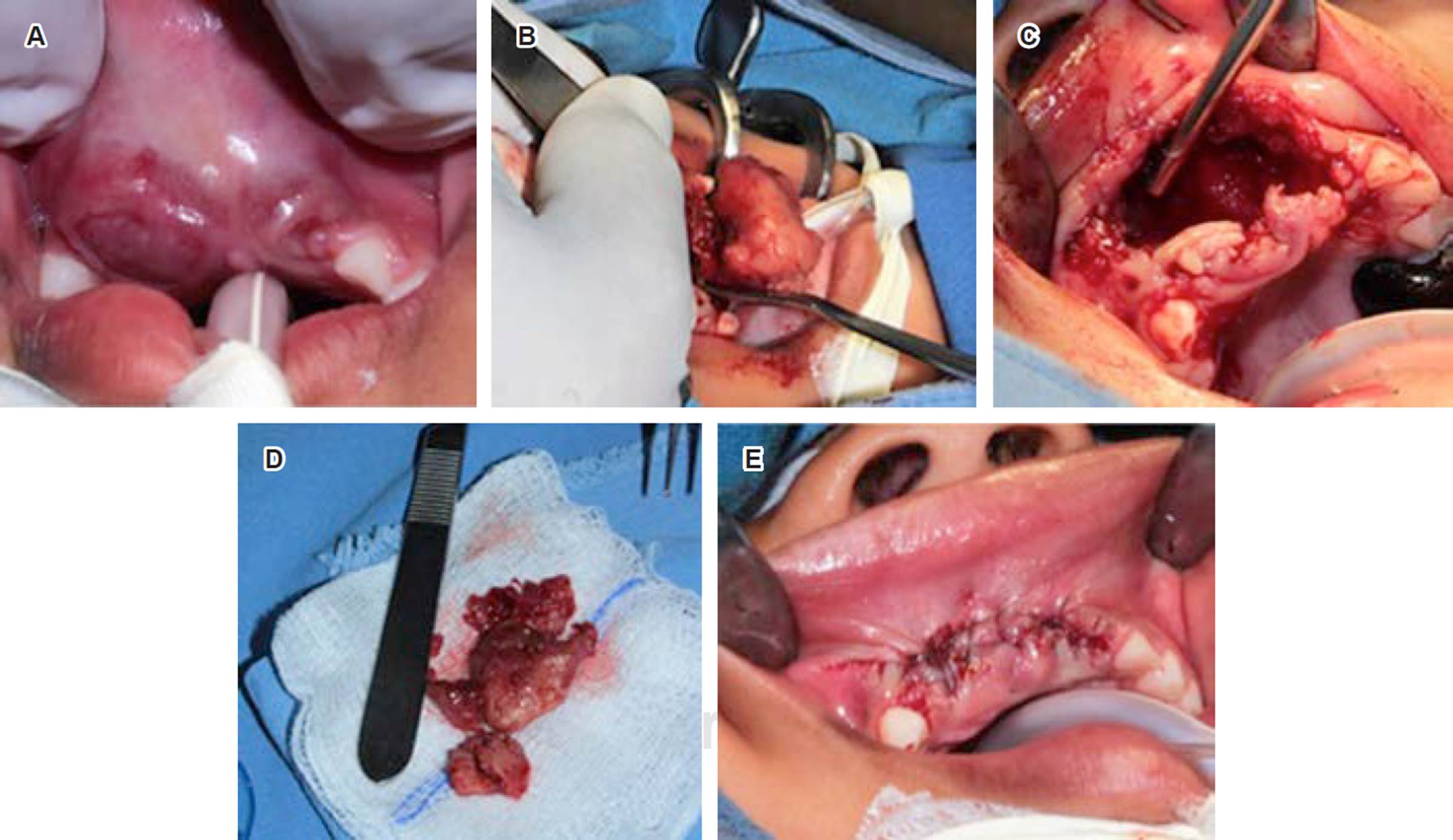 Figura 6 Secuencia de la escisión quirúrgica donde se muestra que la paciente había exfoliado el OD 61 (A), se realiza la exéresis (B) que deja un lecho quirúrgico amplio (C), del que se obtienen múltiples piezas de textura firme (D), se sutura (E) y son enviados a estudio histopatológico los múltiples fragmentos de la lesión.