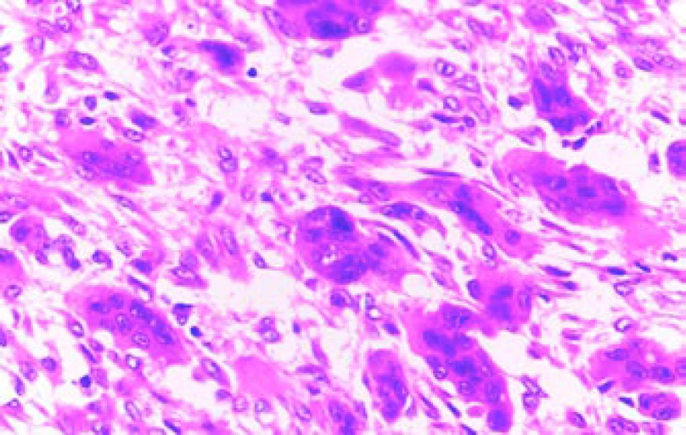 Se descartó una lesión quística y tras la evaluación multidisciplinaria se realizó exéresis quirúrgica bajo anestesia general (Figura 5). Se infiltró anestésico local (lidocaína/epinefrina), seguido de la incisión con bisturí y electrobisturí para su posterior remoción (Figura 6). Con ayuda de una legra se obtuvieron múltiples fragmentos firmes de color amarillo (de 25.0 × 25.0 x 10.0 mm la de mayor tamaño, y menor de 5.0 × 5.0 × 4.0 mm) y se suturó. Se determinó histopatológicamente la presencia de células gigantes multinucleadas (Figura 7), lo que permitió confirmar que se trató de un granuloma central de células gigantes. Se retiraron los puntos 10 días después de la intervención.