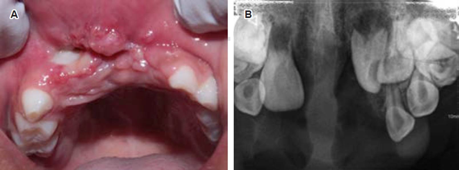 En el examen facial (Figura 1) se notó una clara asimetría y deformación moderada asociada al labio superior. Al examen intraoral, la mucosa labial superior mostró aumento de volumen por encima del frenillo labial, extendido hacia el canino superior derecho (Figura 2A) que involucra al reborde alveolar; se observó de igual manera en el paladar duro anterior, con un aspecto sésil y rojizo, con dolor a la palpación. Dentalmente, se encontraba la paciente en dentición mixta, la ausencia del OD 51 era por una extracción previa, el OD 61 mostraba desplazamiento distal (Figura 2B). Los OD 71 y 81 se habían exfoliado fisiológicamente y el OD 41 se encontraba en erupción temprana. En arcada inferior se observaron los órganos dentarios 72, 73, 74, 75, 41, 82, 83, 84 y 85, los molares deciduos inferiores presentaron lesiones por caries en esmalte y dentina, no hubo alteración en tejidos blandos en dicha arcada (Figura 2C); y en la arcada superior estuvieron presentes los OD 52, 53, 54, 55, 62, 63, 64 y 65.