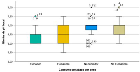 Los resultados del estudio demuestran que los niveles de pH salival de los fumadores son moderadamente más ácidos. Sin embargo, esta condición de acidez no era concluyente en la generación de índices CPOD más altos que el grupo de control.